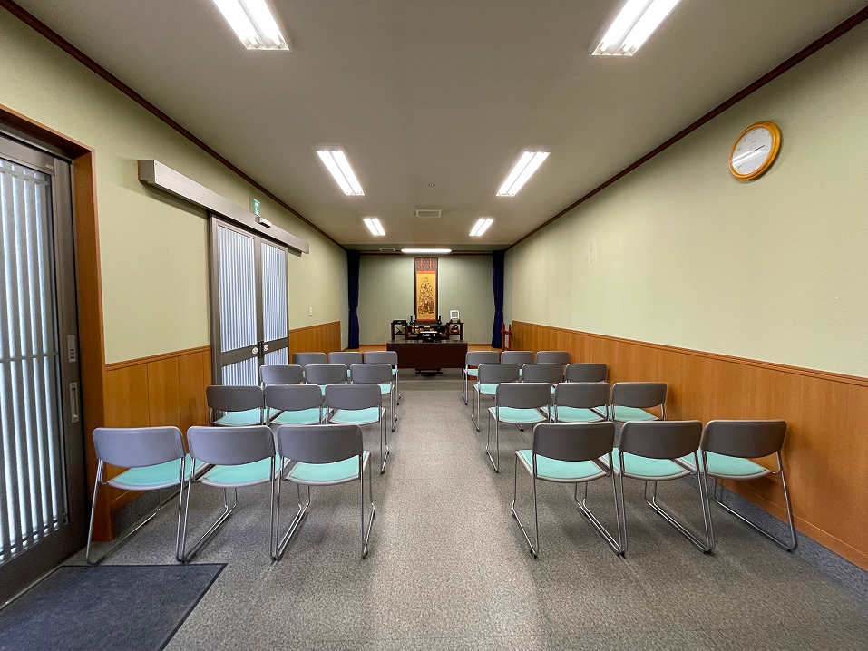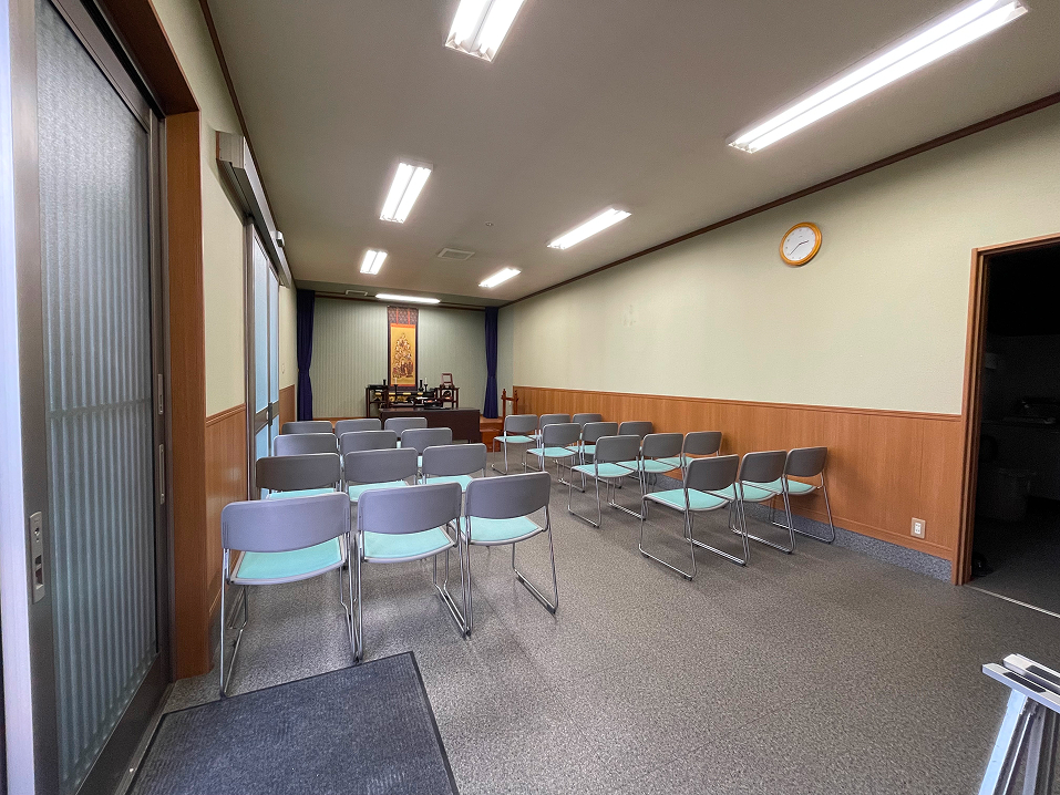 日高市森戸新田の寺院会館。大小の式場を備え、家族葬から中規模のご葬儀に対応。駅からはタクシー数分でアクセスでき、駐車場もあります。