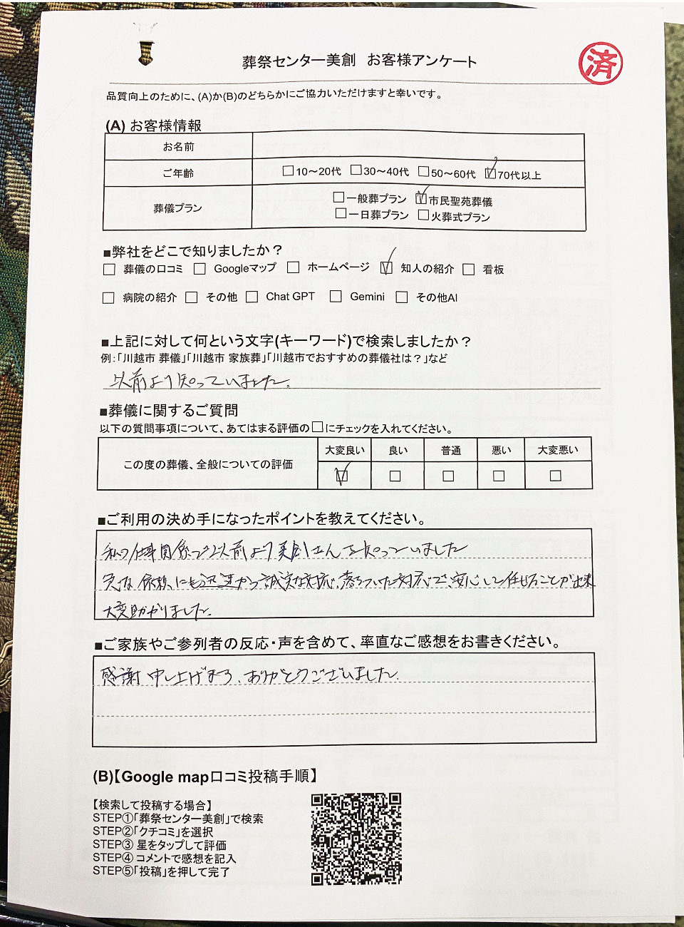 葬祭センター美創では、葬儀を終えられたご遺族の方にアンケートにご協力いただき、より良いサービスの提供に努めております。